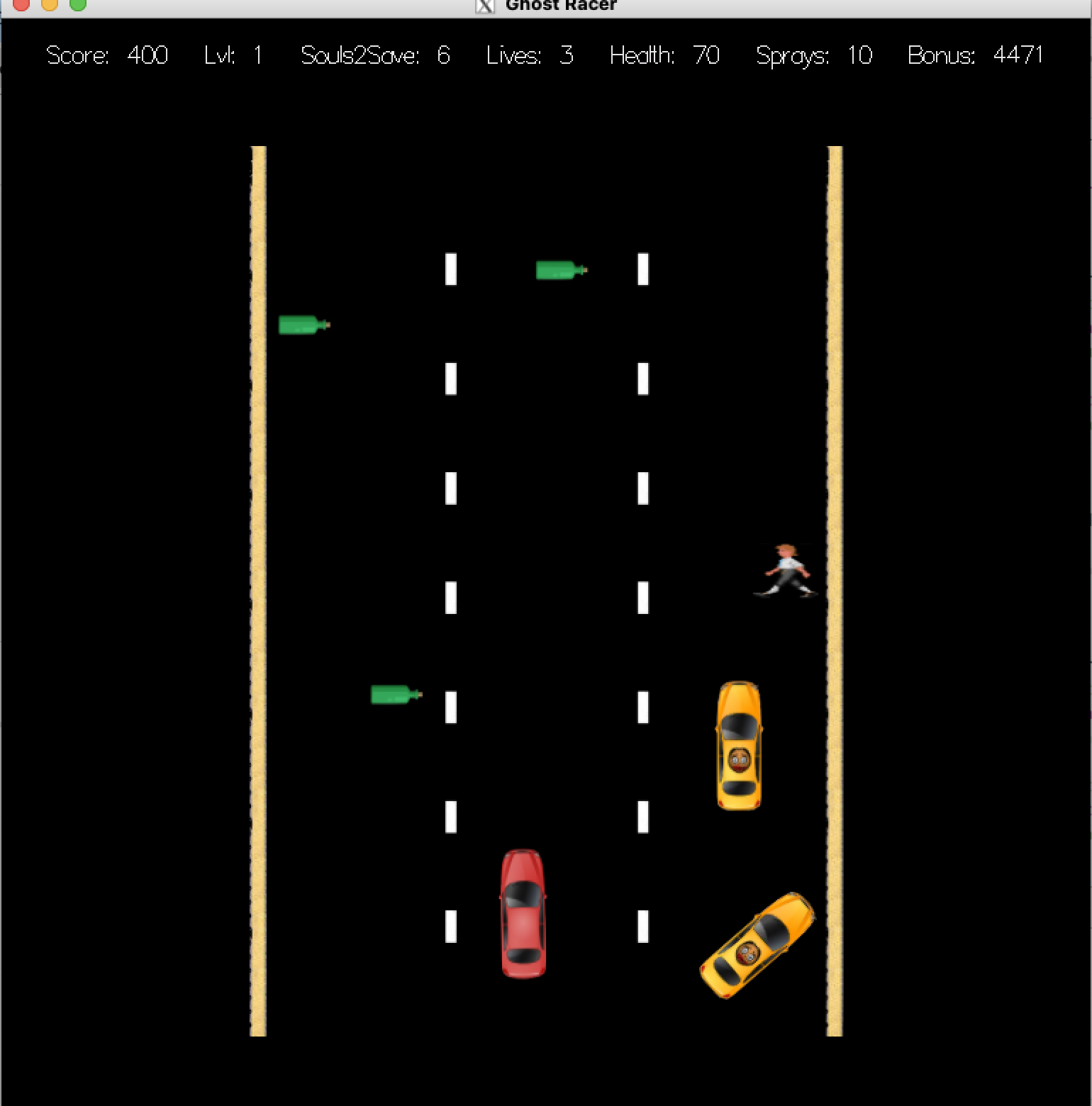 Game where a racer (the user) avoids incoming obstacles, shoots projectiles, and can collect items. Racer status includes attributes such as health, lives, total points etc.
